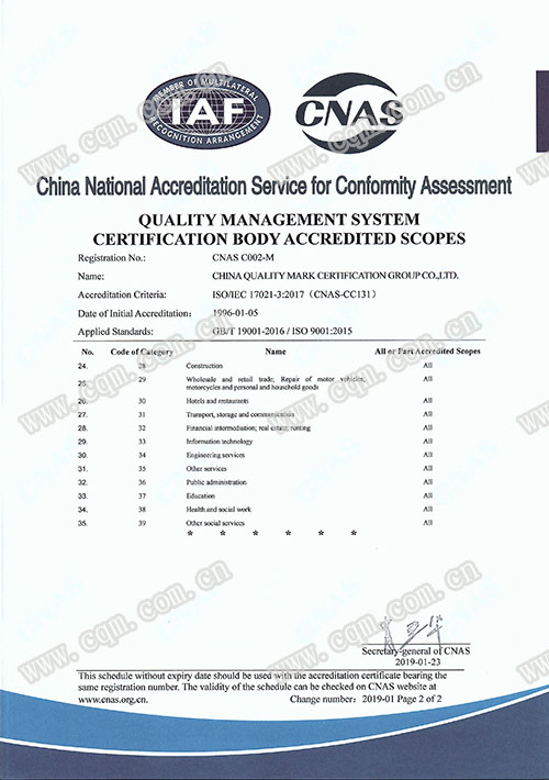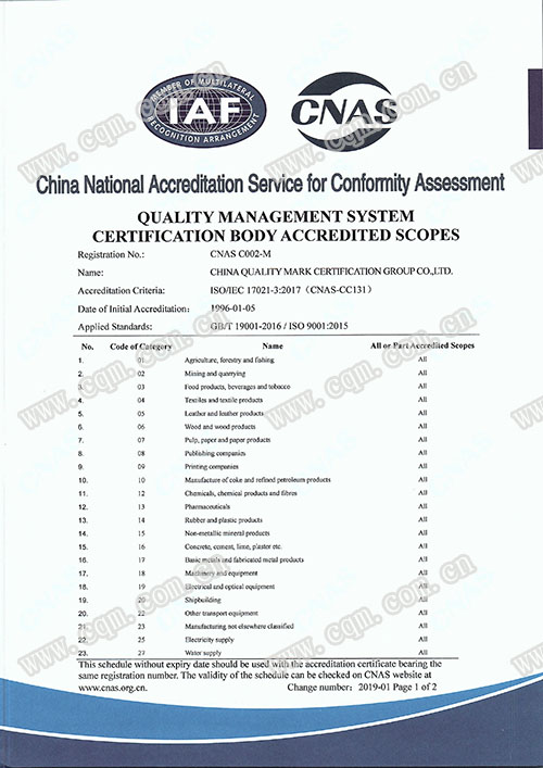 质量管理体系认证机构认可证书