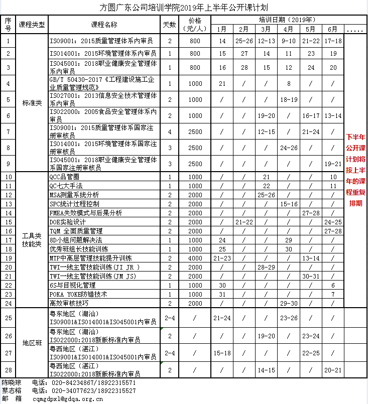 广东公司2019年上半年公开课培训计划