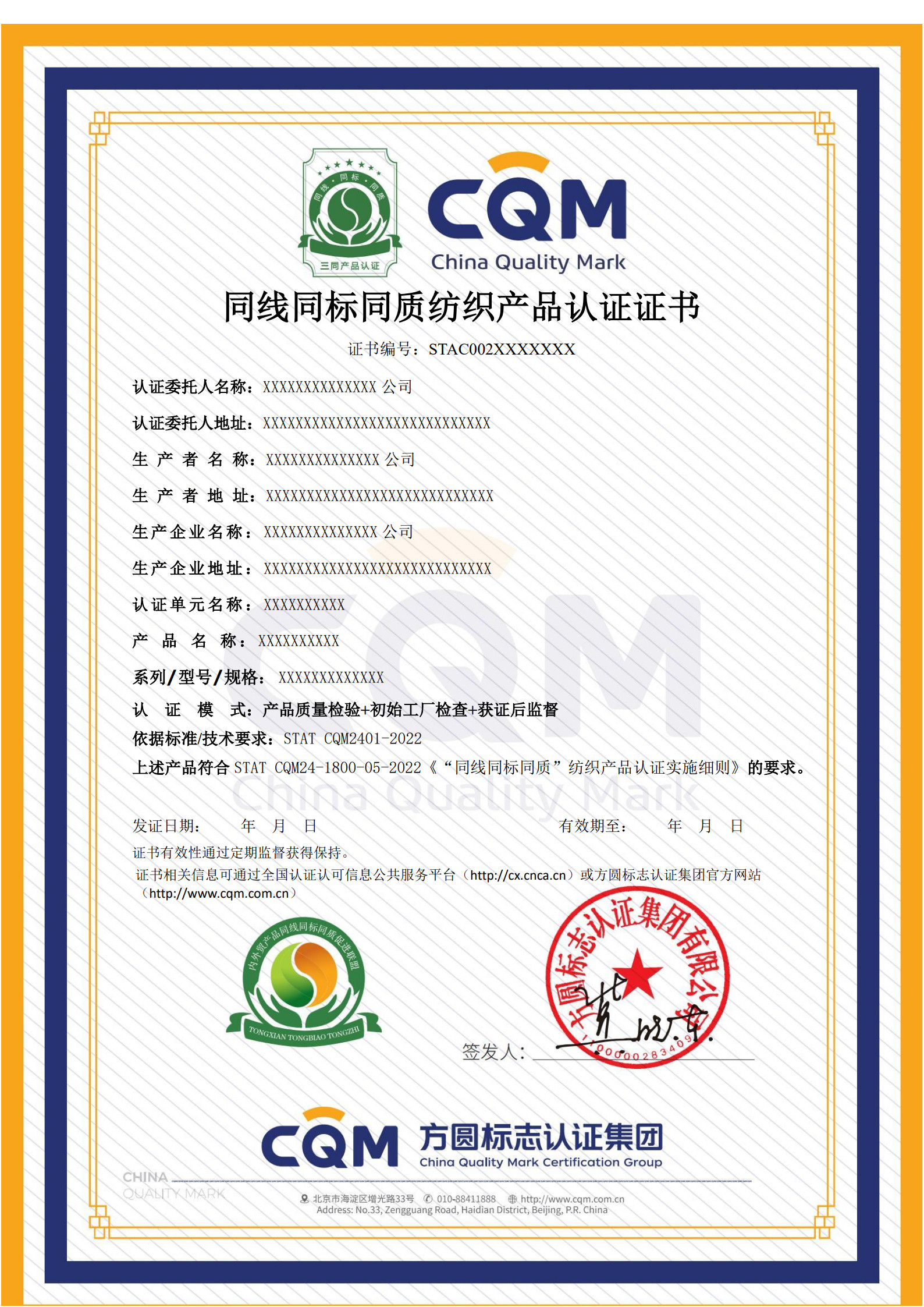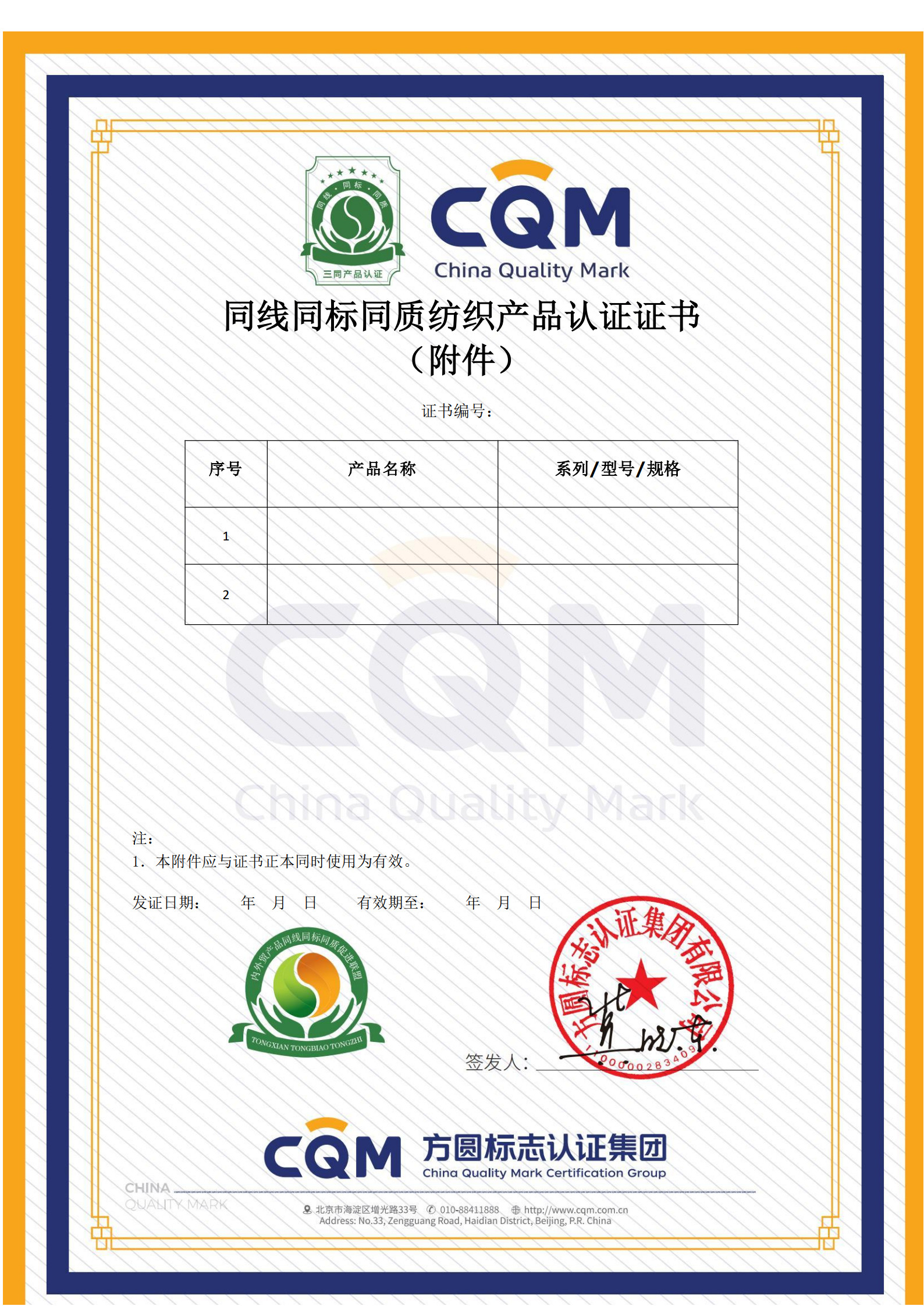 1. 同线同标同质纺织品产品认证证书: